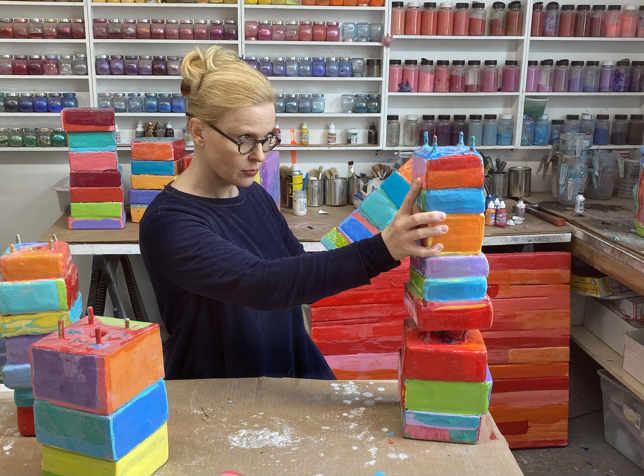 In my sculptures and installations, I typically work with brightly hued resin. Sculptures are made freeform from poured, carved, and manipulated resin dusted with layers of raw pigment, flocking, and sand over mixed media supports. The stand-alone sculptures are more improvisational as they are made, and I may work on them for months before they are resolved, cutting things off and fussing with the surfaces. Installations are more directed, as I usually have a vision for what it should be and it is a matter of making the pieces that will create it. Rubber molds are made from the original sculptures, allowing for hundreds of more pieces to be cast. Casting could be tedious, but here there are many possibilities, as the surfaces can be brushed with pigments and textures rendering each cast unique.