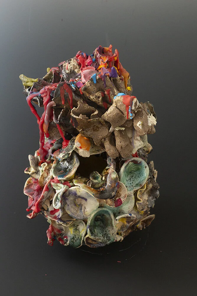The work is compiled from a variety of clay made form made through hand building, mold made and wheel thrown parts. On a given studio day; the work might focus on laying out clay strips to paint, and construct coral or I might be adding more wet clay to a glazed pot to add another layer of material. I have never been someone to sit and work on one thing. Lately I am revisiting old pots. I am building new layers of coils, smoothing them, and incorporating more glazed forms in this new layer onto the surface of something that has already been fired. The process of firing the work starts over, and the layers keep being applied until deemed done. This second chance of being something else is important to my practice in the studio and out of it.